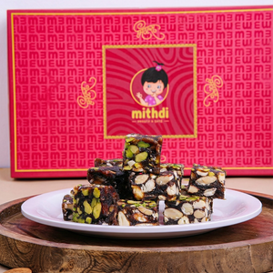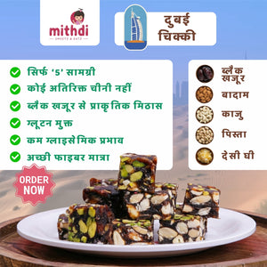 Indulge in pure, natural sweetness with Mithdi’s Dubai Chikki – Black Date Bite, a power-packed traditional treat made from premium black dates (khajur). Completely free from refined sugar, this wholesome chikki is naturally sweetened with dates, then handcrafted with cashews, almonds, pistachios, pure ghee, and rich dry fruits to create a perfectly balanced bite of taste, energy, and nutrition.